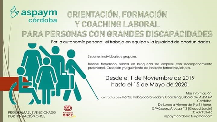 Desde ASPAYM Córdoba estamos desarrollando un programa de Coaching laboral «ORIENTACIÓN, FORMACIÓN Y COACHING LABORAL PARA PERSONAS CON GRANDES DISCAPACIDADES», financiado por FUNDACIÓN ONCE. Un apoyo en la búsqueda activa de epleo/formación, acompañamiento en el itinerario personal y grupal. Cuando:…